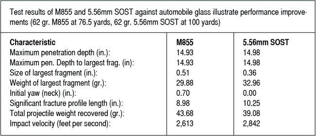 Compared with the 3 to 5 minute-of-angle accuracy of the M855 when fired from a M4A1, 5.56 SOST ammunition shot in a 14-inch Fabrique Nationale SCAR (Light) carbine produced average extreme spreads of 1.71 minutes of angle at 300 yards and 1.67 minutes of angle at 600 yards.