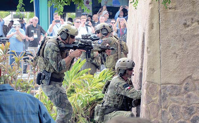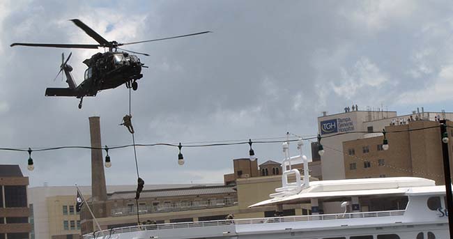 In addition to the new technologies offered by more than 400 exhibitors, the conference featured an International Special Operations Forces (ISOF) capabilities demonstration, where U.S. SOF participated in a rescue operation with ISOF partners from seven other countries. In the demonstration, a high value captive—in this case the mayor of Tampa—was held captive by “terrorists” on a large yacht and then moved to a bunker adjacent to the convention center. To the joy of the Tampa public, an exciting assault on the yacht was conducted by divers, parachutists, helicopter-borne troops and riverine craft. The mayor was safely recovered.
