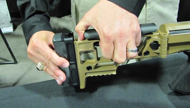 FN’s primary focus for SOFIC was the SCAR-SC, a 5.56mm carbine with a 7-inch barrel that is also available in .300 Blackout. It has a non-reciprocating charging handle that is pushed forward to lock. The SCAR-SC has the normal SCAR gas piston and has an adjustment to compensate for additional gas pressure if a suppressor is used. Also displayed was the FN® Expert, a marksmanship training system for shooters and coaches. The FN® Expert is a small wireless device that attaches to the firearm and can be used for dry-fire and live-fire training together with other optics or accessories. Training is focused on fundamental shooting skills—sight picture, breathing and trigger squeeze. The FN® Expert measures rifle movement, detects the shot, shows the location of both the hit and miss and analyzes the shooter’s performance.