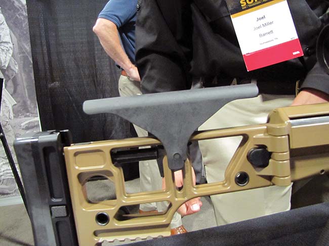 Hot on the trail of the Advanced Sniper Rifle (ASR) program, Barrett will be a tough contender with their Multi-Role Adaptive Design (MRAD). The MRAD is a multi-caliber system that is easily transformed in the field from one caliber to another. These include the .338 Norma Magnum, .300 Norma and 7.62mm NATO to meet the ASR requirement. In total, there are eight different calibers available with the system. The MRAD is suppressor-capable and has a long monoblock Picatinny rail to maximize accuracy with the free-floating barrel. The folding stock and adjustable cheek piece can be swapped over to offer a flat side or rounded side, depending on which is more comfortable for the operator.