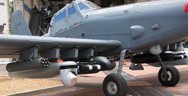 Aircraft equipped with firearms to engage ground targets are always fascinating, because they carry out one of the few tactical missions requiring high rate of fire weapons to accommodate the short time on target. The famous A-10 and C-130 are examples of systems that have proven their worth through countless military engagements and why the low-cost multi-mission AT-802L deserves a serious look. This agriculture and firefighting plane has been fully armored and repurposed as a close air support aircraft. This light aircraft can loiter for more than eight hours and has a payload capacity of more than 8,000 pounds (4,082kg). The model shown has eight stations with a mixture of gun pods, rocket launchers and intelligence-gathering or target-tracking pods. Each station can handle a 500-pound load at its hard points. There are three centerline mounts, two of which are capable of handling 1,000 pounds each.