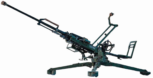The Type 02 is associated with a special low profile mount, which consists of an adjustable tripod with a turntable that hosts the gunner’s seat, traverse and elevation mechanisms and the gun cradle with built-in recoil dampers. When traversing, the entire turntable with gunner and gun is rotated; the rotation is controlled by a horizontal wheel located in front of the gunner. Elevation of the gun is controlled by another wheel, located to the left of the traverse control. The gun’s trigger is operated by the pedal. The entire system is said to be easily disassembled into five man-packs, each weighing 20 kg or less.