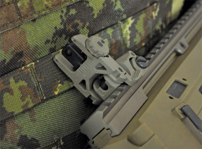 And here came the first surprise: the ARX160SF has been designed for tough guys. All the commands, safety/selector lever, multifunctional button, even the force needed to handle the charging handle, requires more force and a more sharp action as compared to the infantry version. The rotation angle of the safety/selector lever has been kept at 82 degrees, but the strength required to switch the selector into each of the three positions has considerably increased, allowing the operator to have more control if he switched the weapon to semi-auto or full auto fire in situations of strong stress. We were told that this feature was an explicit requirement by Italian SF operators. Additionally, to operate the hold open button to hold the bolt or to make it close when a fresh magazine was inserted required extra exertion. On the top Picatinny rail we found mounted a set of Magpul MBUS Gen 2 iron sights.