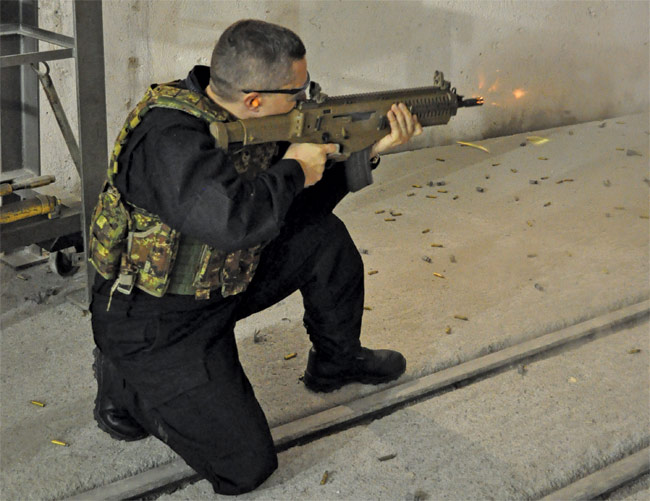 The Beretta SF carbine was tested in full auto shooting in all the three classical positions (standing, kneeling and prone) and from the hip.