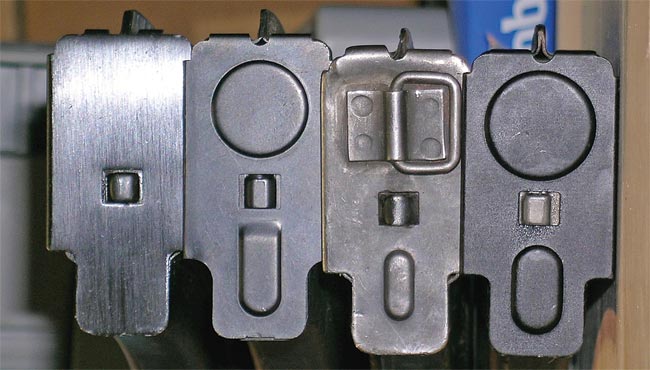 China produced a special 5-round mag for sale with its post ban AKs meant for the US market. Stamped with special dies, it has two vertical ribs and one horizontal rib at the bottom. The Chinese 5-round AK mag uses the Chinese stepped follower, are blued, lack a witness hole, and have “China” stamped on the floorplate. “China” will be found stamped in two different sizes on the floorplate. Huge numbers of these mags were imported before the ban, and many dealers still have these new-in-wrapper for sale.