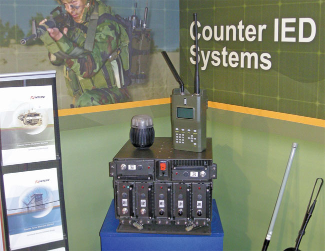 Netline Communications Technologies is an Israeli company that specializes in counter terror electronic warfare. There are two main lines they work with, Military, and Homeland Security. The basic solutions offered are RF Communications Jammers aimed at stopping IED RF communication/triggers. Applications of these units have also been made in prisons to jam cell phone communications, in countries where this is legal. Center on the pedestal: C-Guard VHP ECM which is vehicle mounted and can have up to ten plug-in packs to select jamming channels; lower right: C-Guard TXP ECM is a multi-channel portable (on wheels) unit that provides up to 100W TX power; center left: EWG- Electronic Warfare Grenade which can be tossed into a room to jam any RF trigger instruction while personnel are entering: Center right; JET Jamming Effectiveness Tester to be used to see coverage area; in photo; C-Guard ManPack that allows for multiple channels of jamming on backpack frame. (www.netline.co.il)