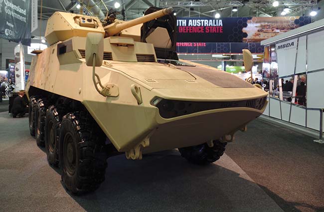 The remote control (CROW system) mount was prominently on display at this show, mostly with the M2HB .50 caliber machine gun. One could easily control this from inside a vehicle using a “joystick,” firing at enemy combatants from relative safety. The booths these were seen at the most were Kongsberg and Elbit Systems of Australia. Rheinmetall, however, upped the ante and used an H&K GMG 40mm Grenade launcher. Some of these were on the vehicles in the hall as well, like the light infantry vehicles.