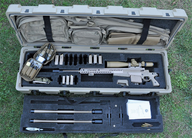An important factor was that after disassembly and reassembly of the weapon, the zero should be maintained and finally, how the sniper platform should be delivered. The major components specifically requested were: the rifle including the barrels, bolts and three magazines per caliber, sound suppressor (not in our case as sound suppressors are illegal for civilian use where we reside), mirage mitigating device, operator manual, sling, cleaning kit, bipod, drag bag and the hard carrying case. All the above in the case the rifle tested meant a total weight (including the scope with no ammo) of about 115 pounds.