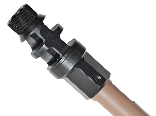 The AX PSR has been designed in such a way that changing barrels is extremely simple because of the solidity of the action body and the generous dimensions of the barrel thread (a protective cover is provided for both muzzle brake and barrel thread when not attached to the rifle). The thread has a 13/1 inch twist rate and a diameter of 1.07 inches with a length at either end of the thread and 1.18 inches at the threads. The length of the entire barrel thread section that interlocks with the action is 1.5 inches.