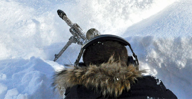 The scope mounted on our AX PSR is the same one that won the USSOCOM contract. It is a Schmidt & Bender 5-25×56 PM II/LP/MTC/LT with the addition of an extension with a honeycomb filter. The model mounted on our PSR has the P4L fein (L meaning that the center of the crosshairs can be illuminated) reticle set in the second focal plane. The click values are 1/4 MOA on both elevation and windage turrets. This scope is essentially the same as the classical 5-25×56 PM II/LP apart from the color. It also has a locking function by using the supplied Allen key to block the elevation and windage turrets. The scope without the honeycomb extension weighs in at 1.15kg (about 2.53 lbs.) and is 41 cm long (16.1 inches). The tube is 34 mm thick. On a clear day at 800m, one can see near misses enter the snow in the mountain – not the splash but the a darkish hole of a direct entry into deep snow.