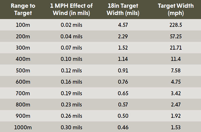This tells you that it would take 2.47 mph of wind (or error in wind velocity estimation) to blow your round off-target if aiming at the upwind side of the target. This means your target at 800 meters is 2.47 mph wide for M118LR ammunition fired at 2600 fps. You can calculate this for all ranges in order to build a chart for use in the field.