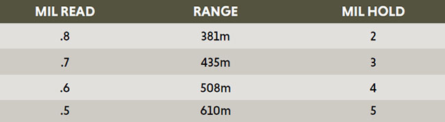 Let’s say you flash mil-read a target from the top of head to top of shoulders (12 inches) at .7 mil. The rule of thumb for a 7.62 sniper rifle that has a muzzle velocity at around 2600 feet per second is mil-read the target and make 10.
