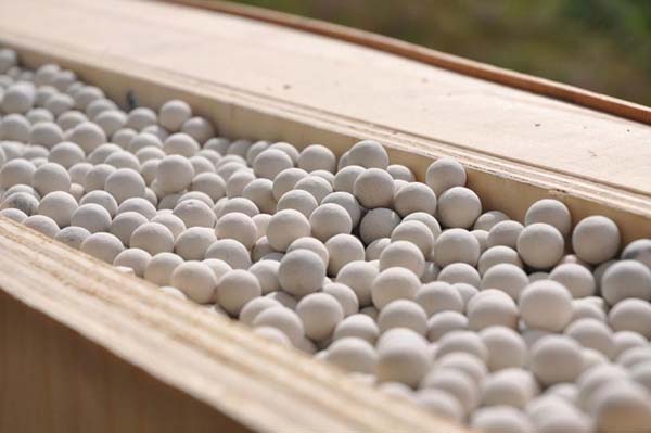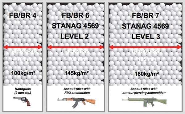 It’s a very simple product in many ways. Soft Armor consists of pellets of approximate 13mm diameter (1/2 inch), and they are made of aluminum dioxide and silicon dioxide. This patented mixture is mold proof, does not absorb moisture, and is static until fired upon with a projectile or fragment of a mortar round. When a projectile penetrates the outer layer, it comes into contact with the ceramic pellets, which become unsettled and fluid, tumbling around the projectile until it comes to a halt. Directly hit pellets are crushed, absorbing energy, and the remaining energy from the projectile is distributed throughout the other pellets. This is often described as similar to the effect of one ball in billiards striking many others, which absorb and distribute the divided energy. In effect, one will observe some pellets crushed to powder by the projectiles and almost instantly replaced by others around them, as the projectile is diverted off-trajectory and energy is spread throughout the assembly. A 200 round burst from a belt-fed weapon, aimed into the same area, will not penetrate!