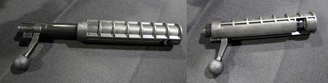 Each changeover kit comprises a barrel, bolt head and magazine. The magazine bodies are alike, but the followers are specific to the type of ammunition being used. To change caliber in the field, the operator switches out parts and brings the bolt forward to the locked position while the barrel is loose. At this point, the barrel retaining screws are socked in and headspace is set. Another interesting feature is the polymer bolt guide, which provides a smooth surface along which the bolt can glide.