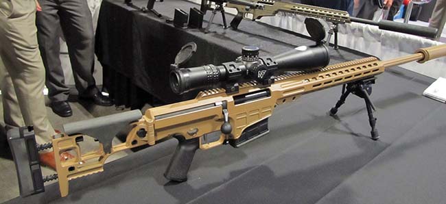Hot on the trail of the Advanced Sniper Rifle (ASR) program, Barrett will be a tough contender with their Multi-Role Adaptive Design (MRAD). The MRAD is a multi-caliber system that is easily transformed in the field from one caliber to another. These include the .338 Norma Magnum, .300 Norma and 7.62mm NATO to meet the ASR requirement. In total, there are eight different calibers available with the system. The MRAD is suppressor-capable and has a long monoblock Picatinny rail to maximize accuracy with the free-floating barrel. The folding stock and adjustable cheek piece can be swapped over to offer a flat side or rounded side, depending on which is more comfortable for the operator.