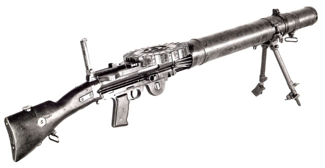 The primary principle on which the gun worked was gas operation. A small hole was drilled into the barrel. As the bullet traveled past the hole the rapidly expanding gasses behind it would be tapped off from the barrel through the hole into a gas accumulation chamber where it would impinge upon a piston driving it rearward. The piston was connected to an operating rod and bolt. During this rearward movement the bolt would extract the spent cartridge case and eject it through the ejection port to the right rear. A stud located on top of the bolt also engaged a feed arm which engaged and extracted the next round from the double layer, circular pan magazine located on the top of the gun. The mechanism had two stop pawls that ensured that the magazine rotated the correct distance to line up the next cartridge. Additionally, during the rearward movement of the piston, operating rod and bolt, a rack on the underside of the operating rod engaged a pinion which wound a clock-type spring, located just in front of the trigger that would store the energy needed to return the operating parts forward while chambering and firing the next round. The bolt had rotating locking lugs that locked into recesses in the barrel extension and unlocked when high pressure was reduced to a safe level.