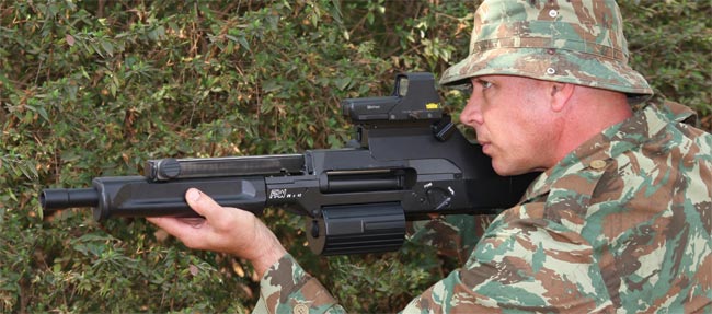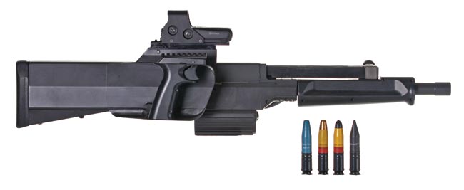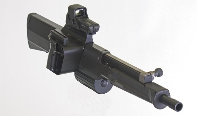 To launch such a projectile, a unique new layout for the weapon was needed that was small enough to fit in future war fighting capabilities.  A new design for the weapon was devised that could isolate as much as possible from the operator the recoil of such a munition.  The pistol grip is an integral part of the stock and is positioned on the right side of the weapon.  The weapon is allowed to recoil independently into the buttstock, which decreases peak recoil to a manageable level and also allows for use by either left or right handed shooters.  The rest of the weapon makes use of well-proven, widely used elements such as a multi-lug rotating bolt, conventional gas system and a conveniently loaded six-shot rotary magazine.  Coupled to the 20x42mm cartridge, it offers the user an obvious tactical advantage.