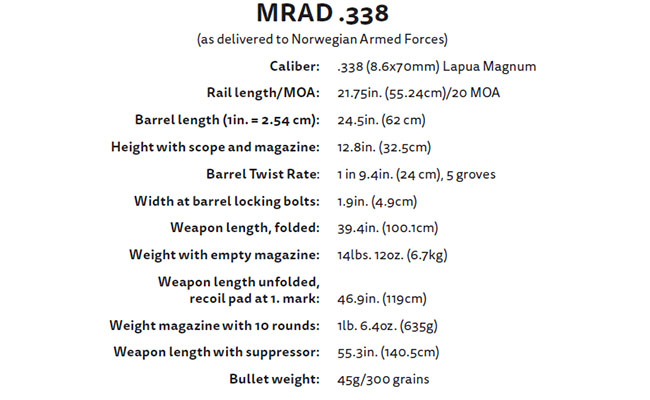 Said Capt. Jensen: “The sharpshooters themselves refer to the weapon as ‘the laser rifle’ due to its unmatched accuracy and reliability. They know that if they miss the bull’s-eye, they cannot blame their MRAD! After being used throughout winter and spring conditions, there have been a few details that have had to be modified, something to expect when a new weapon system, for first time, is taken into use. But none of these have reduced the snipers’ enthusiasm for the weapon. It’s a weapon they proudly show off and always choose when the demands are greatest. The weapon’s capability has proved to work under all conditions. The technical solutions combined with the material quality have made this sniper rifle not just a solution for today’s needs, but also for the future. The MRAD’s design allows the rifle to be adapted to future needs and new requirements. This applies both to quick change of caliber and adding additional accessories that may be required.”