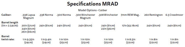 The MRAD concept comes from an actual military program. They wanted a multi-role design, a multi-caliber rifle and an extended rail so they could mount thermal night vision and anything else in front of the sight along with a folding adjustable length stock and adjustable cheek piece. Multi-role means user-changeable caliber barrel system using the same chassis. Adaptive design means that it’s adjustable for anybody.
